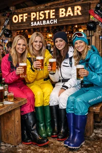 Seilbahnfahrt in Gummistiefel und Skikleidung